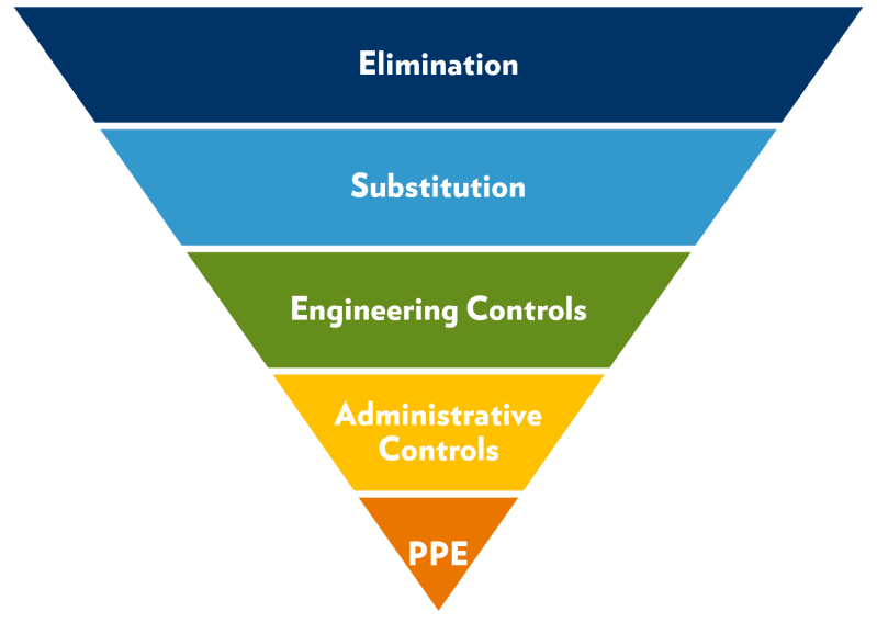 In the safety world, we follow what is known as the "Hierarchy of Control" to attempt to mitigate hazards and injury. The Hierarchy of Control is depicted as an inverted triangle with five sections, as shown below.